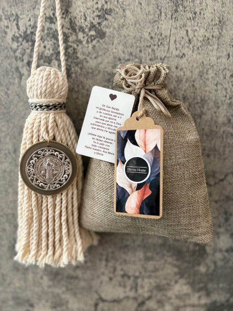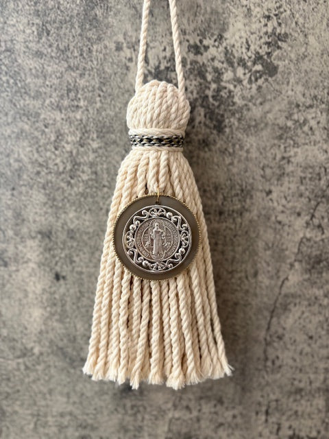 Bendición para hogar de hilaza de algodòn con medalla San Benito metàlica color plata