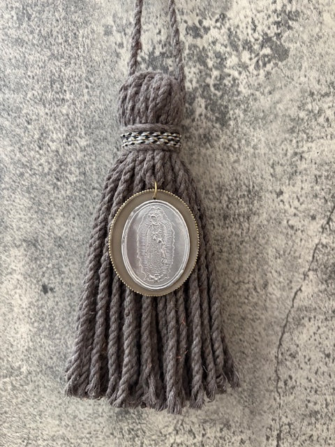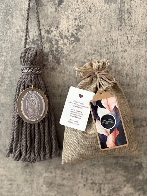 Bendición para hogar de hilaza de algodòn con medalla Virgen Guadalúpe aluminio repujado color plata