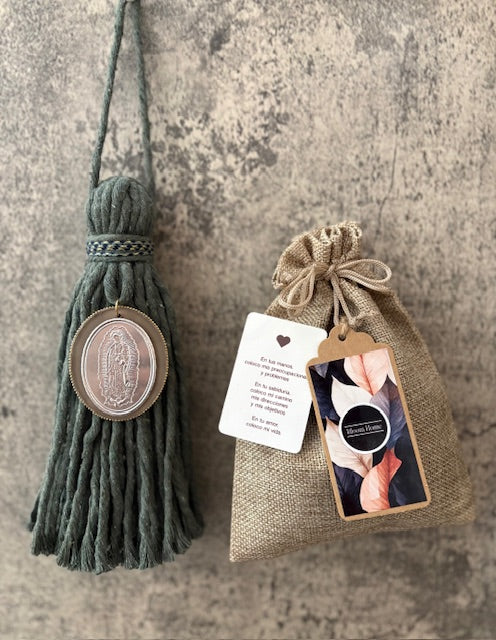 Bendición para hogar de hilaza de algodòn con medalla Virgen Guadalúpe aluminio repujado color plata