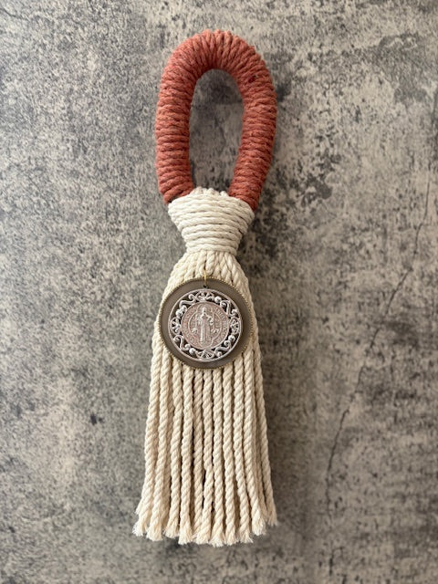 Bendición para hogar de hilaza de algodòn con medalla San Benito color plata
