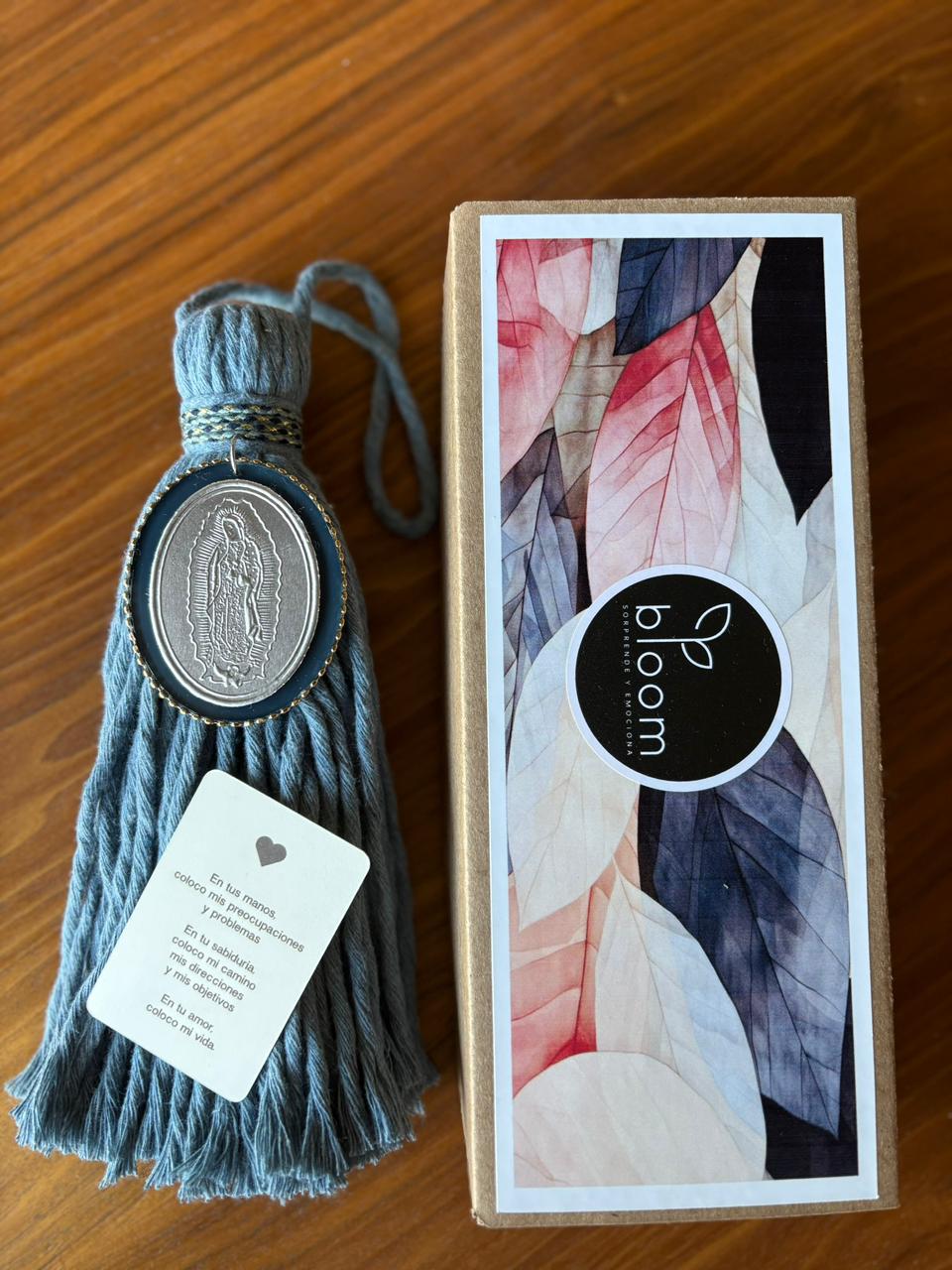 Una caja de regalo perfecta, es una borla de macrame de algodon con medalla Virgen de Guadalupe (colores rosa,azul, kaki, crudo, gris cemento oscuro). Ideal para poner en la puerta de entrada de la casa para recibir miles de bendiciones y protección de tu santo san benito