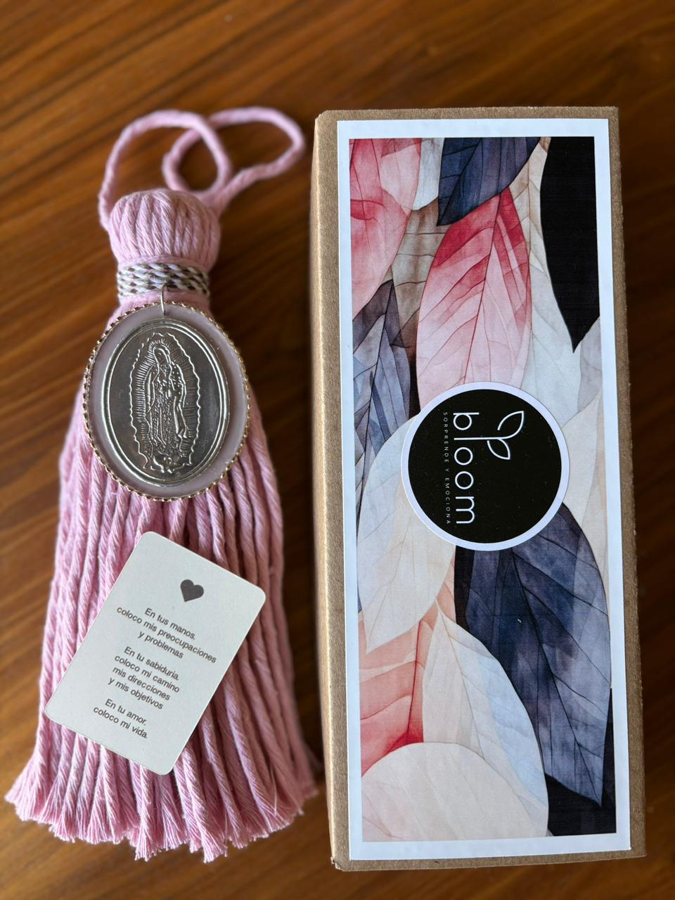 Una caja de regalo perfecta, es una borla de macrame de algodon con medalla Virgen de Guadalupe (colores rosa,azul, kaki, crudo, gris cemento oscuro). Ideal para poner en la puerta de entrada de la casa para recibir miles de bendiciones y protección de tu santo san benito