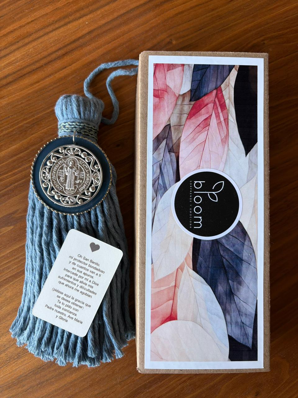 Una caja de regalo perfecta, es una borla de macrame de algodon con medalla de san benito (colores rosa, nude, cafe, crudo, azul grisaseo). Ideal para poner en la puerta de entrada de la casa para recibir miles de bendiciones y protección de tu santo san benito