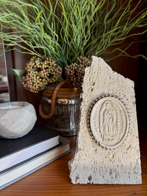 Transforma cualquier rincón en un santuario de paz. Este retablo de la Virgen Guadalupe es una pieza de arte sacro contemporáneo que fusiona la solidez del cemento artesanal con la delicadeza de la joyería. Su diseño minimalista y equilibrado está pensado para quienes buscan manifestar su fe con una estética impecable y moderna.